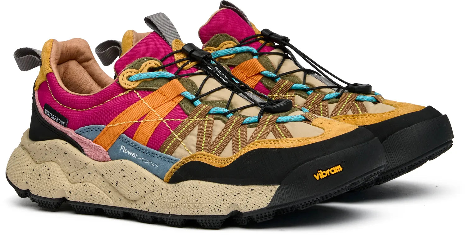 The Flower Mountain Iwano 2 brings outdoor-inspired energy to your everyday stride. This multi-colored suede trainer combines trail-ready features with urban appeal, featuring a quick-release lacing system for effortless adjustments and natural cork insoles that naturally resist bacteria. The cleated rubber sole grips confidently on varied terrain, while leather lining and convenient pull tabs make these as practical as they are eye-catching.